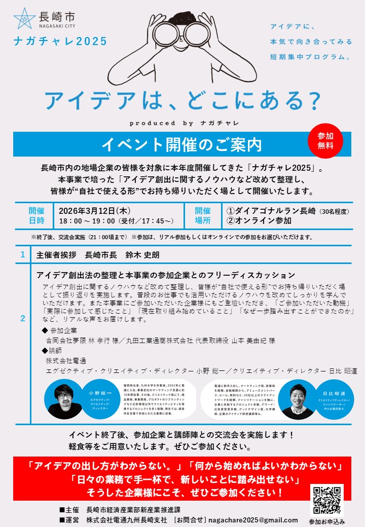 本年度実施してまいりました「ナガチャレ2025」もいよいよ2026年3月12日(木)に最終イベントを迎えます。本事業で培ったアイデア創出に関するノウハウなど、皆様が“自社で使える形”でお持ち帰りいただく場として開催いたします。